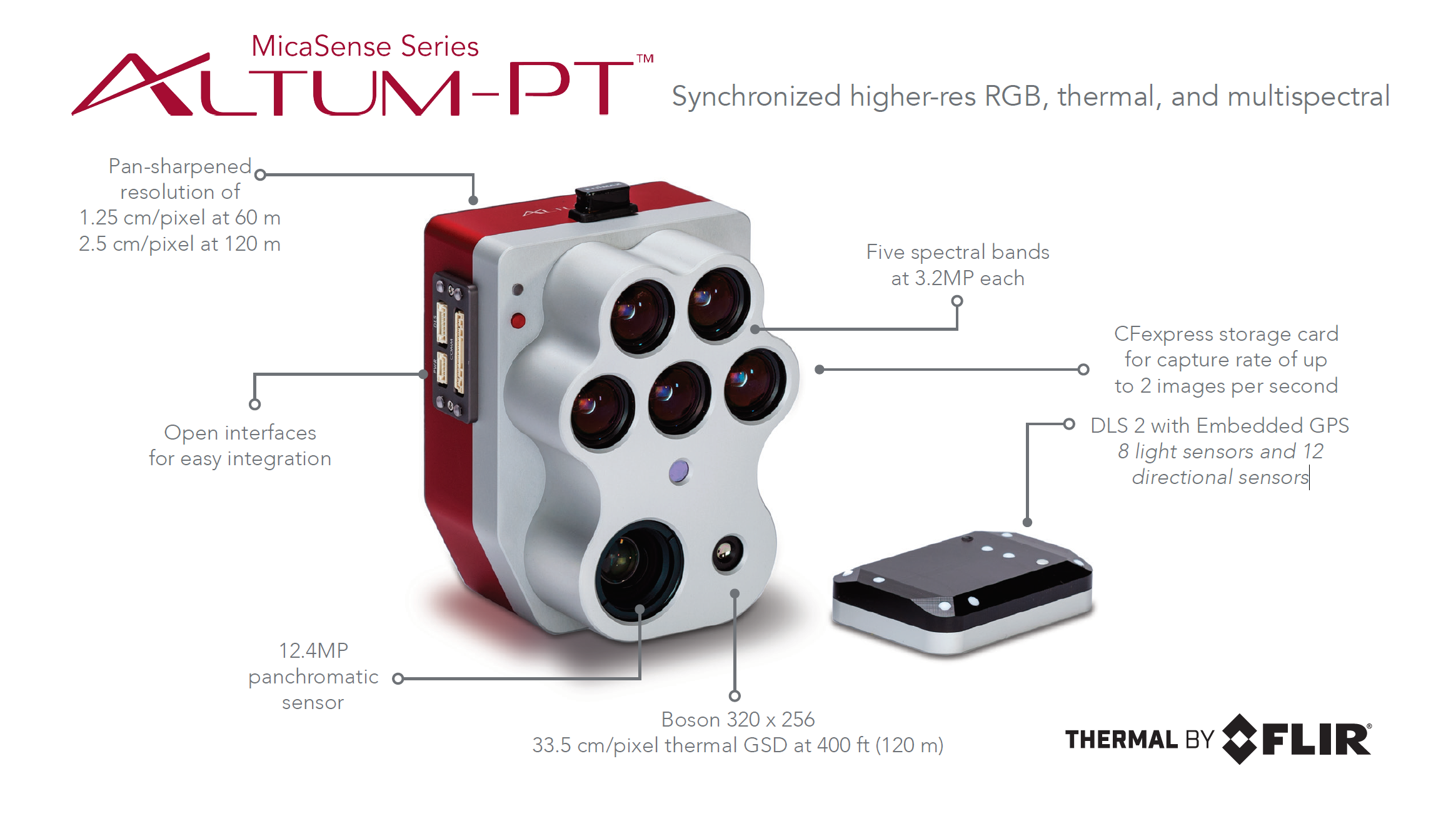 The Altum-PT is an optimized 3-in-1 solution for advanced remote sensing and agricultural research. This solution seamlessly integrates an ultra-high-resolution, 12 MP panchromatic imager, a built-in 320 x 256 radiometric thermal imager, and five discrete spectral bands to obtain synchronized outputs such as RGB color, crop vigor, heat maps, and high-resolution panchromatic in just one flight. Higher resolution also means more analytical capabilities and applications: discern issues at the plant level, even in the early growth stages, including early-stage stand counting. Altum-PT also features a global shutter for distortion-free results on any platform, open APIs and standard data formats for compatibility with multiple processing platforms, and a new professional removable storage standard in CFexpress, for two captures per second and the fastest turnaround time between flights.