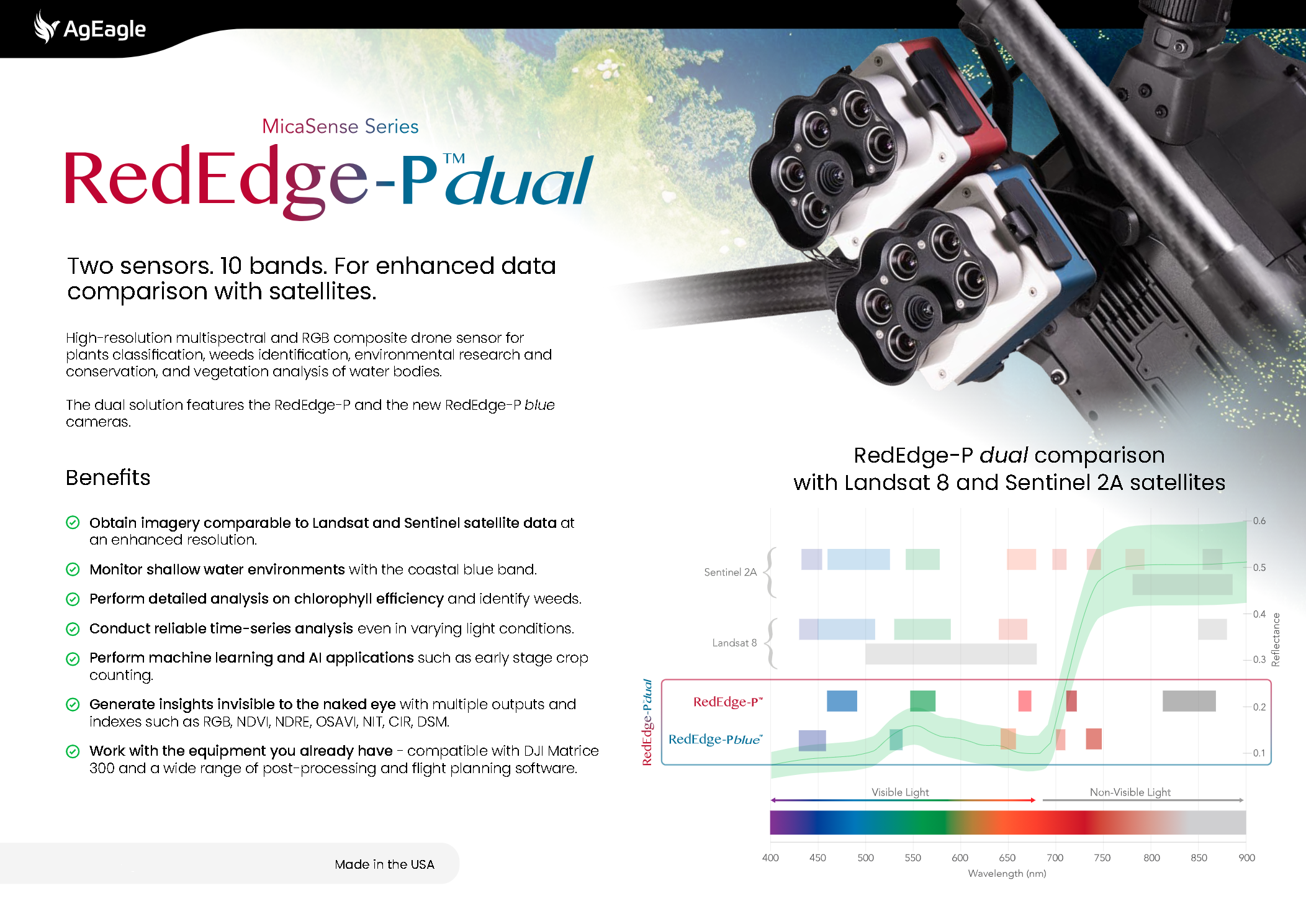 Introducing AgEagle’s RedEdge-P dual: 10-band high-resolution multispectral and RGB composite drone camera.